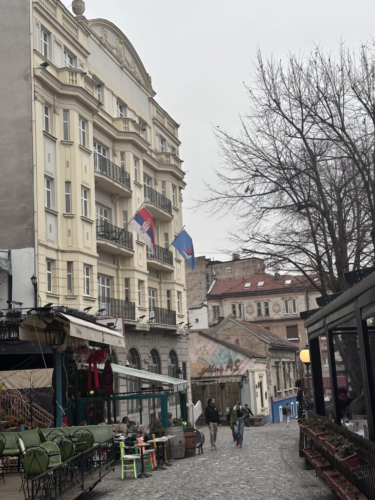 Belgrad’ın en eski ve en karakteristik mahallelerinden biri olan Skadarlija , bugün turistlerin uğrak noktası. Arnavut kaldırımlı dar sokakları , geleneksel restoranları ve nostaljik havasıyla adeta geçmişte yürüyormuşsunuz hissi veriyor. Geçmişi , sanatçılarla ve edebiyatçılarla dolu eski bir mahalle. Arnavut taşlarla döşeli yolları yürümek zorlayıcıydı . Skadarlija ‘ daki restoranlarda yemek yemek istiyorsanız önceden rezervasyon yaptırmanız gerekiyor. Bende , anlamı “Üç Şapka “ olan ünlü Tri Sesira restoranı için internetten rezervasyon yaptırdım. 1864 ‘te açılmış olan bu mekan , hem yerel halkın hem de turistlerin uğrak noktası ve genellikle canlı Sırp müzikleri çalmaktadır.